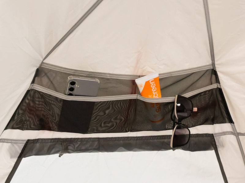 Традиционно в палатке Комфорт использованы качественные материалы и продуманы многие неочевидные на первый взгляд детали. Сетчатые панорамные окна со шторками и внутренний карман для вещей добавляют удобства на пляже, а карманы для песка и 4 оттяжки служат для безопасной установки палатки. Материал шатра – полиэстер Таффета с покрытием PU Silver, отражающий более 98% ультрафиолета. Плотность материала пола увеличена со 150D до 210D.