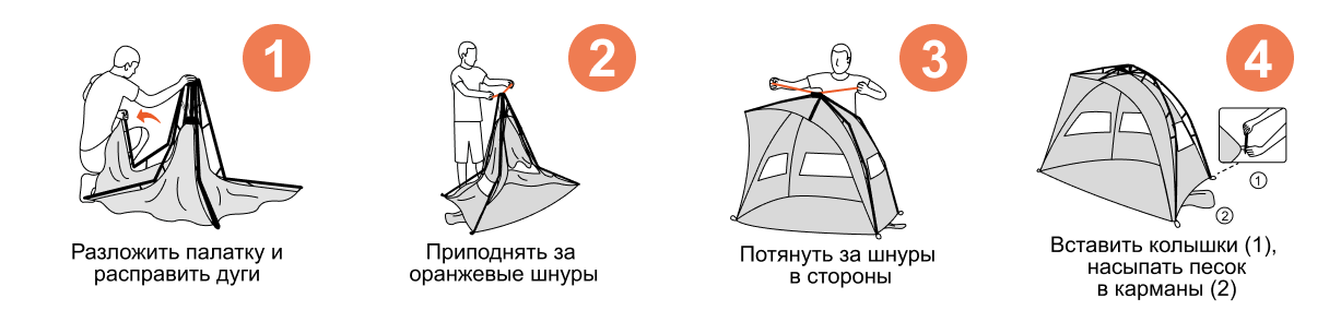 Пляжные палатки «Оранжевое лето» закрепляются с помощью колышков по периметру, внешних карманов для песка и гальки, и 2 или 4 оттяжек в зависимости от модели
