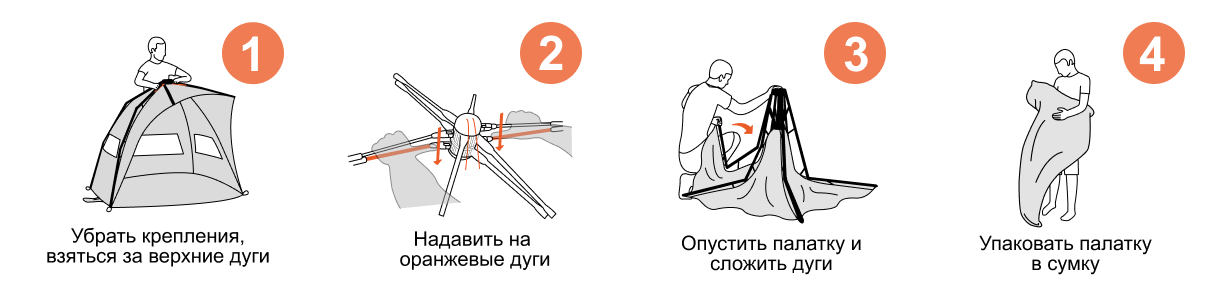 В пляжных палатках «Оранжевое лето» используется зонтичный механизм раскрытия и сворачивания каркаса, позволяющий устанавливать и собирать палатку за 2-3 минуты.